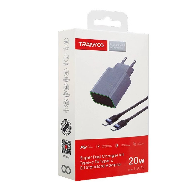 شارژر دیواری سوپر فست 20 وات ترانیو همراه با کابل تایپ سی مدل T-EU7 C